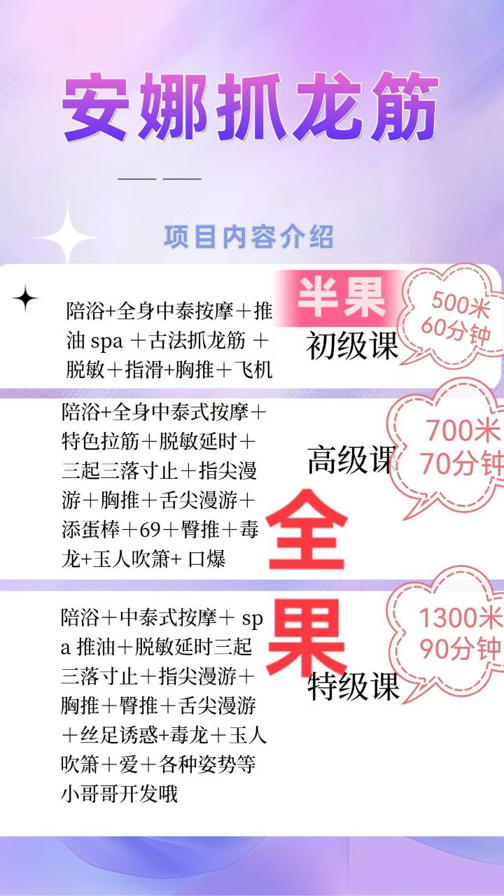 服务项目:陪浴+全身中泰按摩+推油spa+古法抓龙筋+脱敏+指滑+胸推+飞机