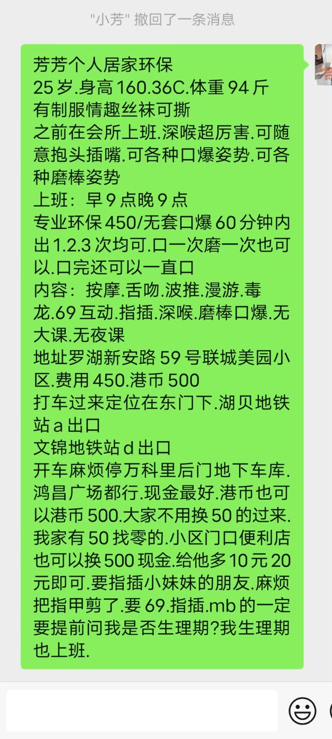 凡是有要求路费/定金/保证金/照片验证/视频验证等任何提前付费的行为,千万不要上当。同时也请注意仙人跳,在寻欢前不要露富和带过于贵重随身物品。本站为分享信息并不对寻欢经历负责,碰到有问题的信息,请及时举报给我们删除信息。